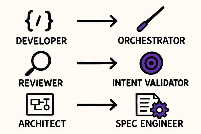 Reviewer becomes intent validator. Traditional code review asks: is this code correct? Is it clean? Does it follow our patterns? Those are the wrong questions when the code was generated by an agent that produces syntactically perfect, well-structured, thoroughly wrong implementations.