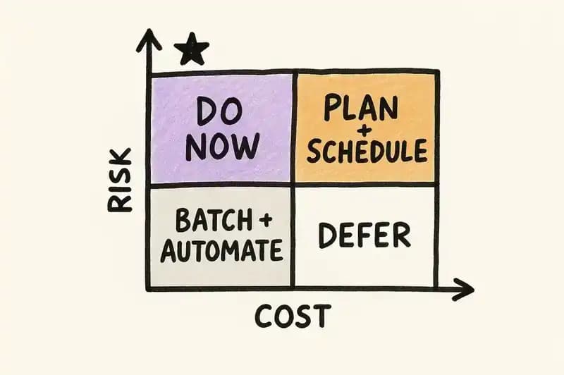 Quadrant 1 -- High risk, low cost: Do now. A compliance gap that requires a configuration change. A security constraint that needs a single enforcement point. These are the highest-ROI items in your backlog. There is no reason to defer them.