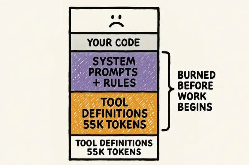 Your agent just burned 55,000 tokens initializing. It loaded tool definitions for three MCP servers, injected system prompts, parsed JSON schemas for every available endpoint, and allocated context for enums, field descriptions, and parameter constraints. It hasn't read a single line of your code yet. It hasn't seen your prompt. Over a quarter of Claude's 200K context window is gone, and the meter is running.