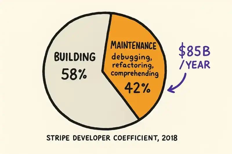 The average developer in that study worked 41.1 hours per week. Of those hours, 17.3 went to maintenance: debugging and refactoring. That is 42% of a developer's working life spent not building, but fixing.