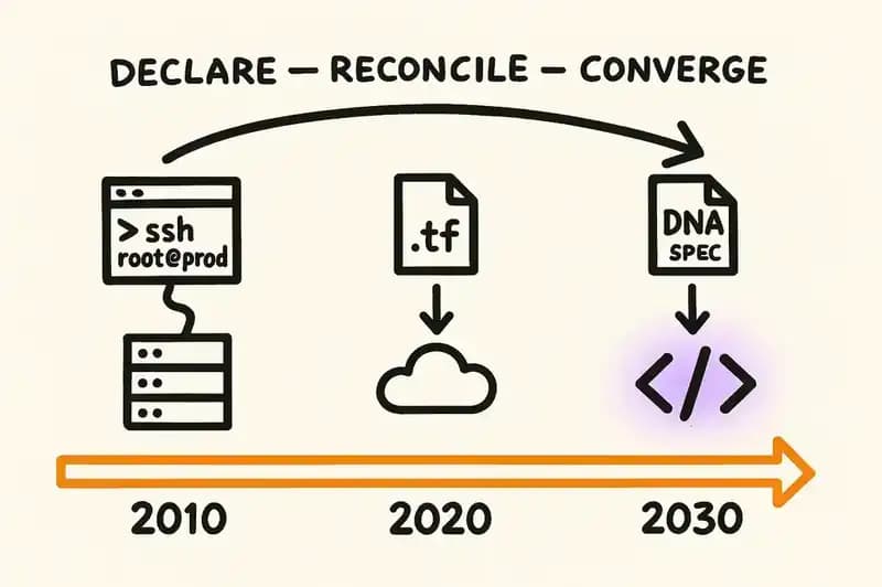 That was infrastructure management in 2010. Manual, imperative, stateful only in the sense that the state lived in someone's head and on a server that could vanish.