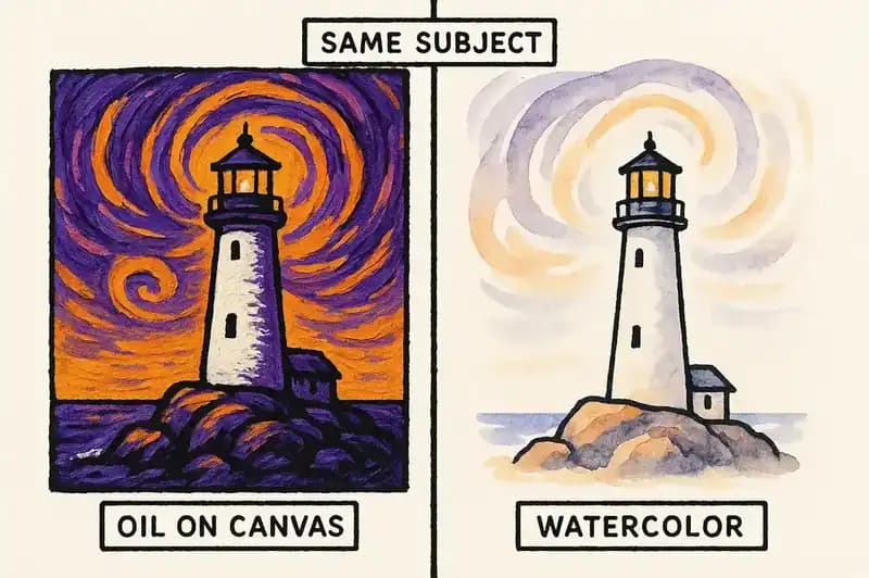 Imagine the identity declaration is: "Paint a lighthouse scene. Swirling sky. Blue palette. A face in the foreground." That's the DNA. It declares intent without specifying medium.
