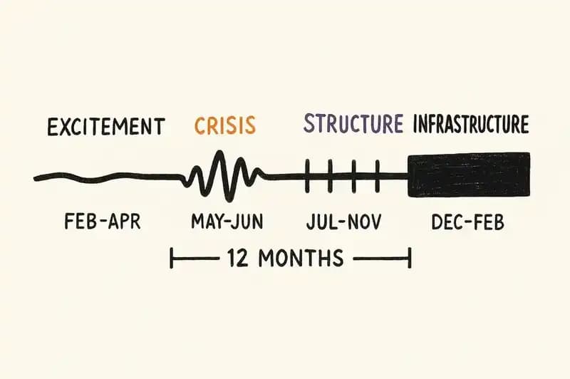 We've been watching this play out in real time, and the reversal itself isn't the interesting part. Pendulums swing. The speed is the interesting part. This is the fastest paradigm shift in modern software history, and it followed a pattern that, in retrospect, looks almost inevitable: excitement, crisis, structure, infrastructure. Each phase compressed into weeks, not years. Each one forced by the failures of the one before it.