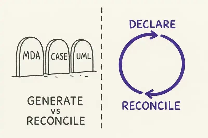 You're right to be skeptical. MDA failed. CASE tools failed before it. Executable UML failed alongside it. The graveyard of "declare the system, generate the code" is large enough to have its own Wikipedia category. Anyone selling the next version of that idea owes you a direct explanation of why this time is different.